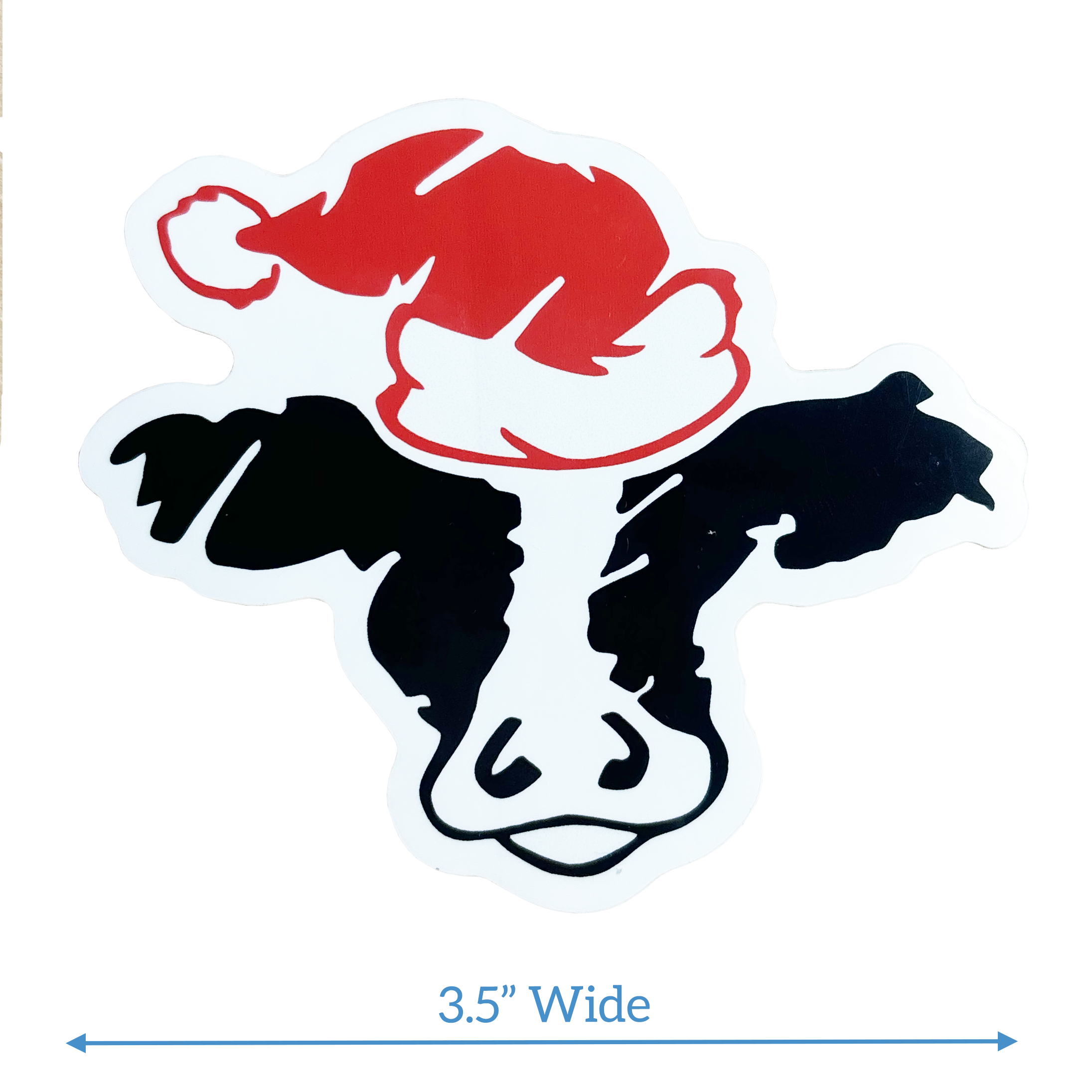 There’s not a lot to say about this sticker. Like our other sticker, it’s a great sticker. It’s sticky. It’s got our cow wearing a Santa hat. It’s pretty sweet.